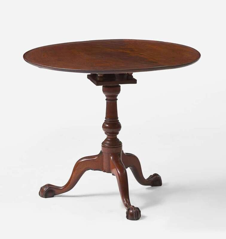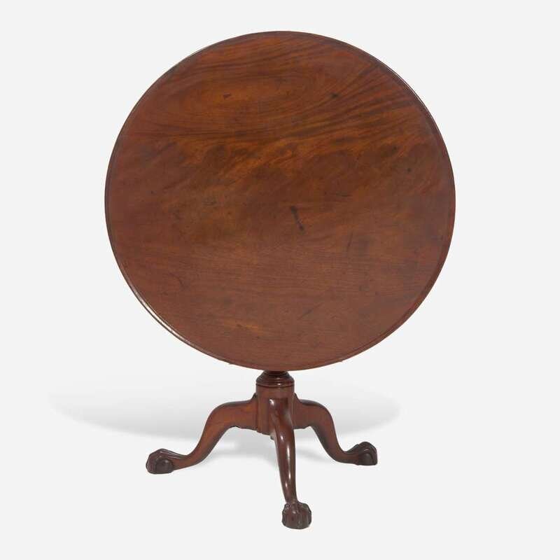 Single-board dished top, belted suppressed ball support with bird cage support having conforming posts, cabriole legs ending in ball-and-claw feet, retaining label to top underside, inscribed, "Made and Sold/ By/ George Pickering/...Philadelphia."