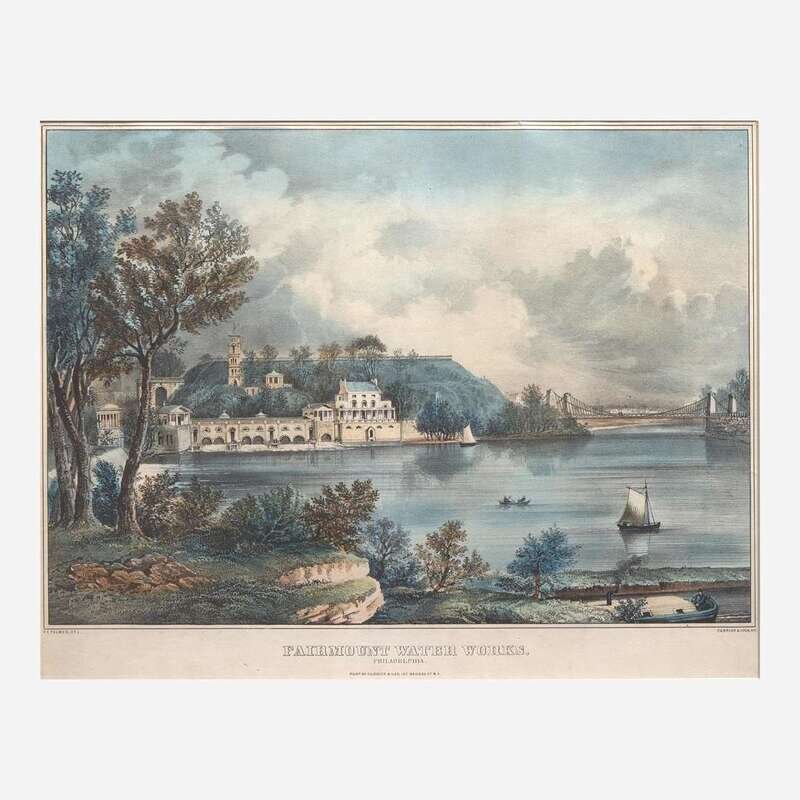 Watercolor on paper, framed; together with hand-colored lithograph, "Fairmount Water Works," Fanny Palmer, delineator, Currier & Ives, publishers.