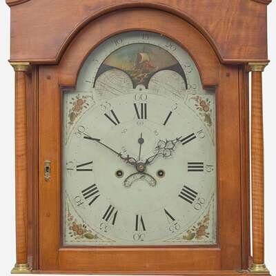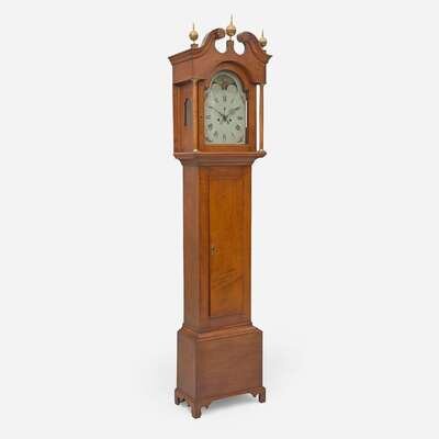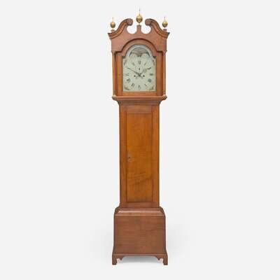 The hood with broken pediment, carved rosettes, brass ball and steeple finials, the enamel face faintly inscribed, "T... Chandler," decorated with floral motifs to each quadrant, moon phase dial, the case with rectangular door, molded base on shaped bracket feet.