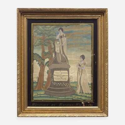 Worked with paint and silk threads on a silk ground, inscribed "They are Pure Beings in A Nobler Sphere," and "In Sacred Remembrance of Beriah Willard who died Aug 31th 1801 AE 13 and Catherine Willard who died Sept 10th 1802 AE 6," the eglomise mat inscribed, "Wrought by Rachel Willard," the original frame retains printed paper label of John Doggett, Roxbury, Massachusetts.