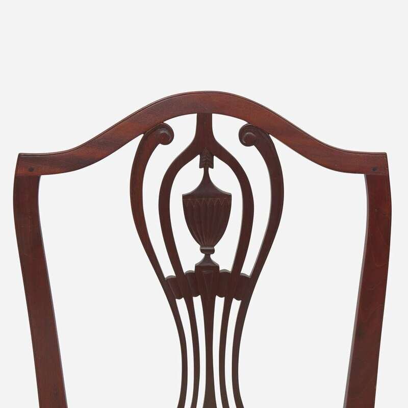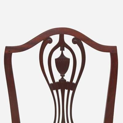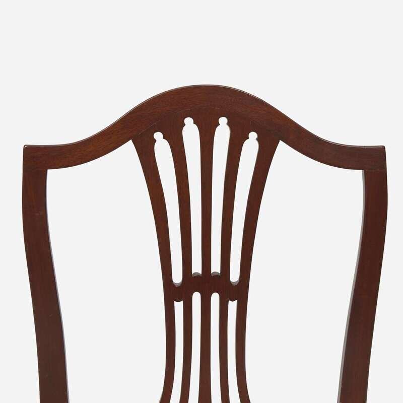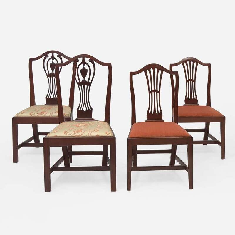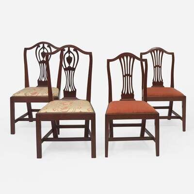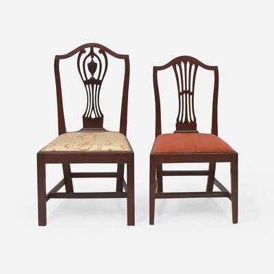 Comprising two pairs of chairs, the first with pedestal backs, possibly Connecticut or Rhode Island, having straight legs and stretchers; the second pair with shield backs, tapered legs and stretchers.
