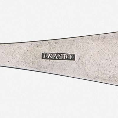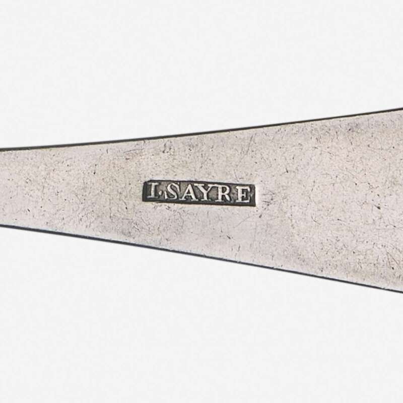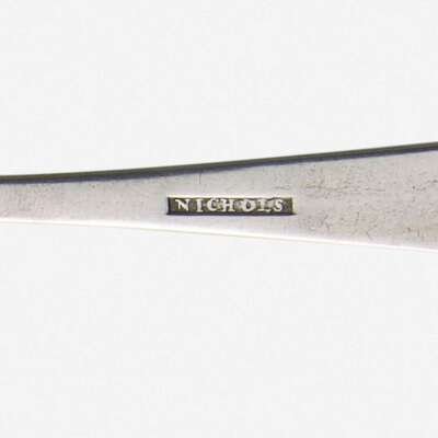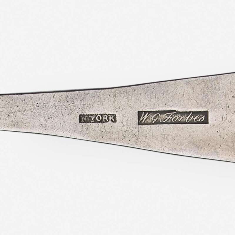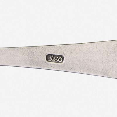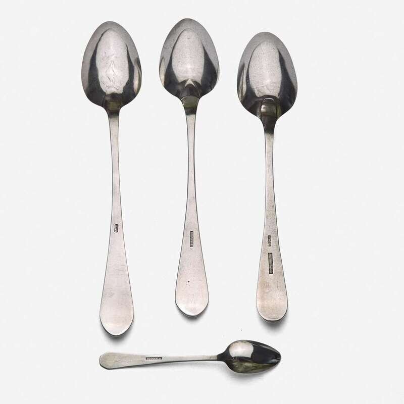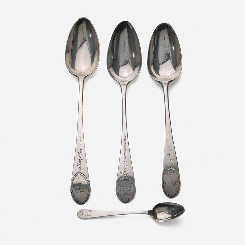 Comprising a tablespoon by John David, Sr., circa 1790, with bird-back bowl, bright-cut decoration, navette reserve to handle end engraved, "LGT," marked; a William Garret Forbes tablespoon, circa 1800, with drop to bowl back, bright-cut decoration, navette reserve to handle end engraved, "AVH," marked; a John Sayre tablespoon, circa 1796, with drop to bowl back, bright-cut decoration, navette reserve to handle end engraved, "R/ D*M," marked; and a William Stoddard Nichols teaspoon, circa 1810, with coffin end engraved, "L/ P*W," marked.