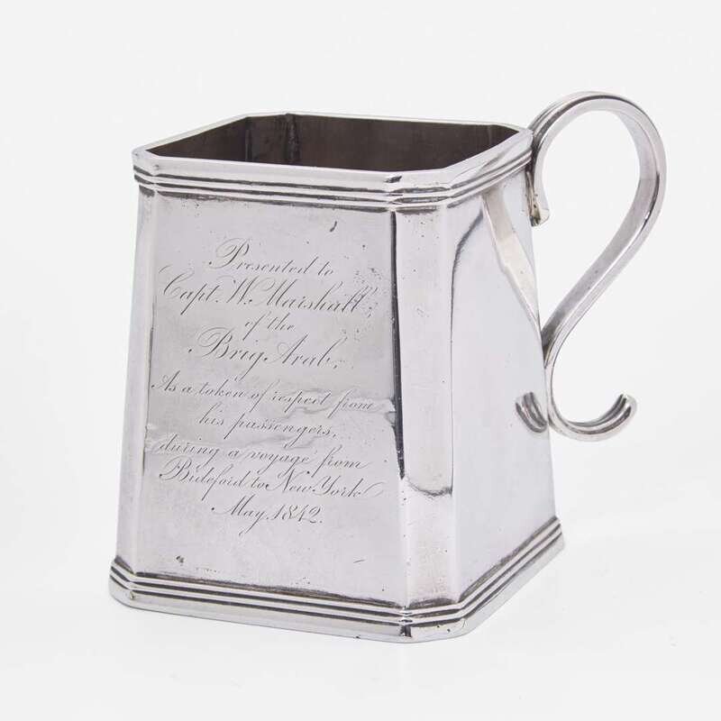 Tapering sides, molded base and rim, scrolled strap handle, the front engraved, "Presented to Capt. W. Marshall, of the Brig Arab, as a token of respect from his passengers, during a voyage from Bideford to New York May 1842," marked to underside, "Ball Tompkins & Black Successors to Marquand & Co."