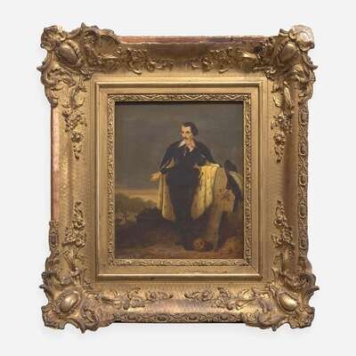 Signed in cipher, "JA" and inscribed on verso, "Kean as Hamblet/ by/ Jan Angus," and accession number, "1891.1.3," oil on panel, framed.