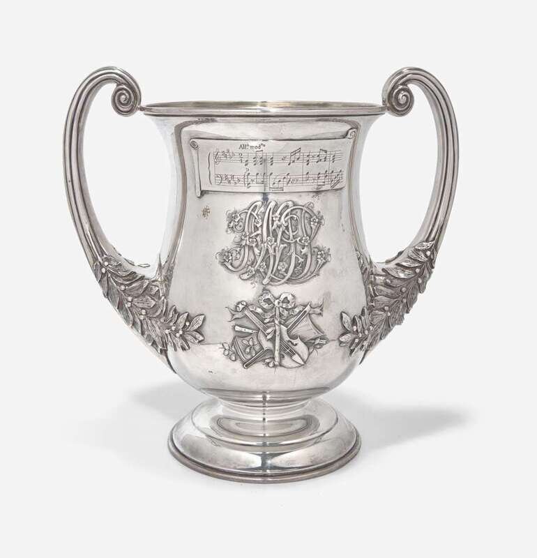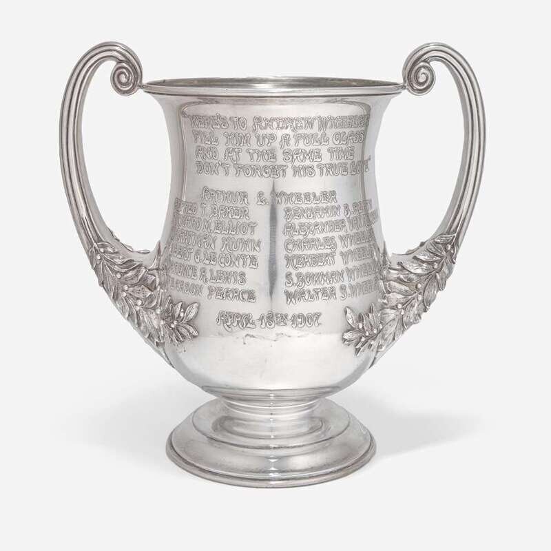Of urn form, one side ornamented with the applied presentation, "Heres To Andrew Wheeler/ Fill Him Up A Full Glass / And At The Same Time/ Don't Forget His True Love," above the names, "Arthur L. Wheeler, Alfred T. Baker, Richard M. Elliot, C. Hartman Kuhn, Robert G. Le Conte, Clarence A. Lewis, D. Pearson Pearce, Benjamin B. Reath, Alexander Van Rensellaer, Charles Wheeler, Herbert Wheeler S. Bowman Wheeler, and Walter S. Wheeler:" the verso with applied panel engraved with the opening musical measures of the bridal march from Richard Wagner's opera Lohengrin, above the entwined initials "AW and JP," and a panoply of musical instruments.
