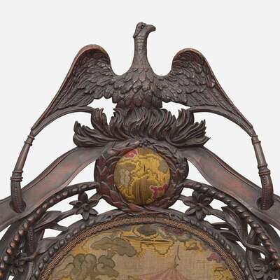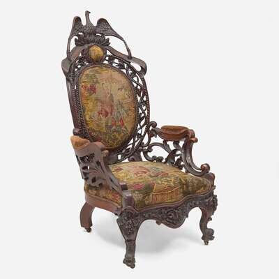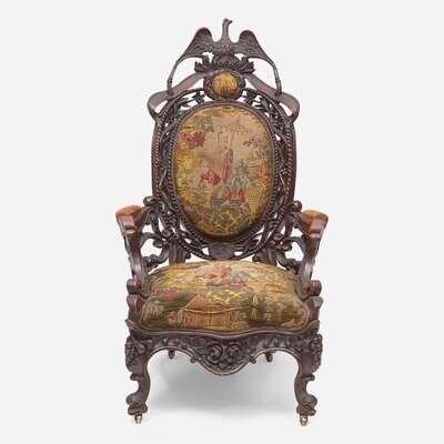 The elaborate cresting carved in the form of two firehose nozzels spouting water on figure of a phoenix rising from flames, the chair back carved with entwined fire hoses and vines, carved dolphin feet, on casters.