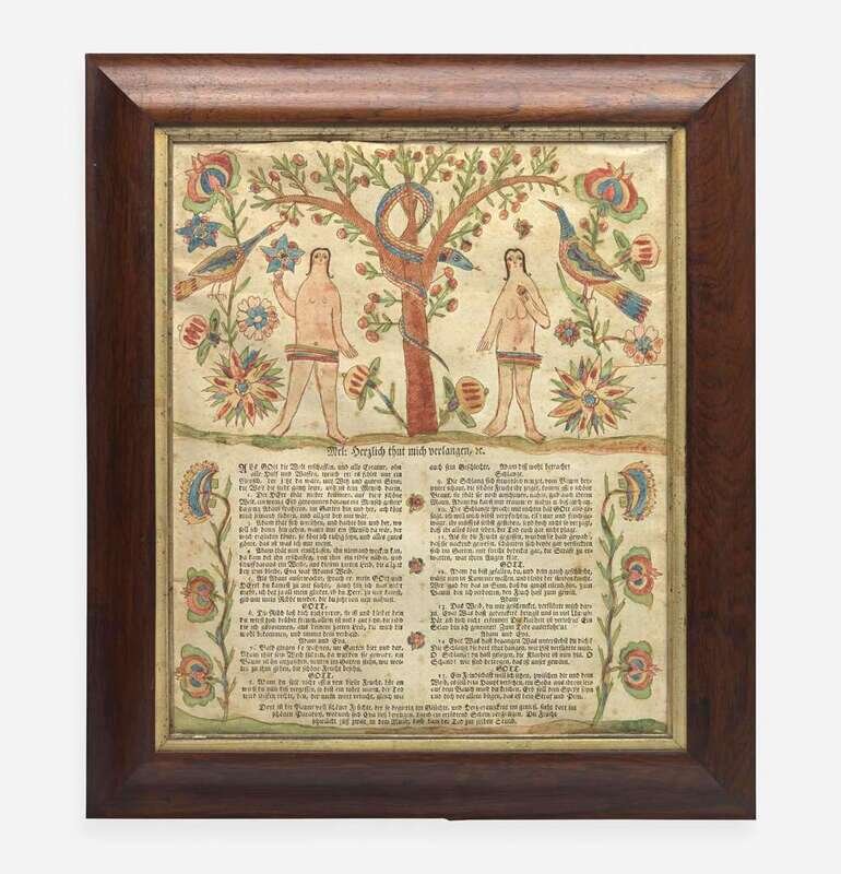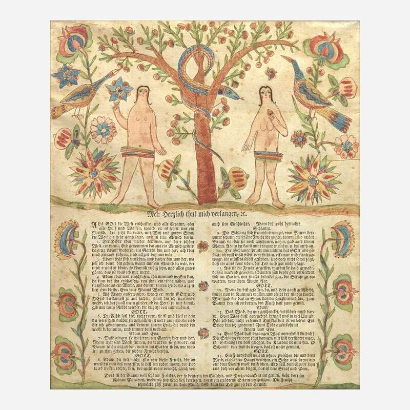 An Adam and Eve hand-decorated letterpress broadside decorated by Georg Friedrich Speyer (active 1774-1801), circa 1790