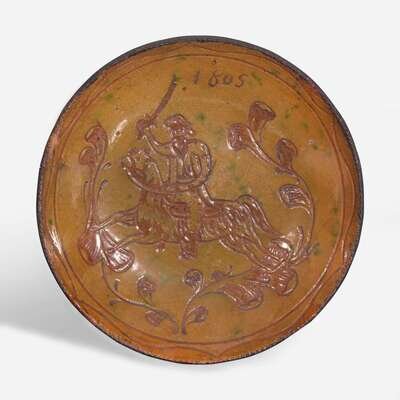 A glazed sgraffito-decorated redware plate depicting a horse and cavalier attributed to Jacob Medinger (1856-1932), Montgomery County, PA