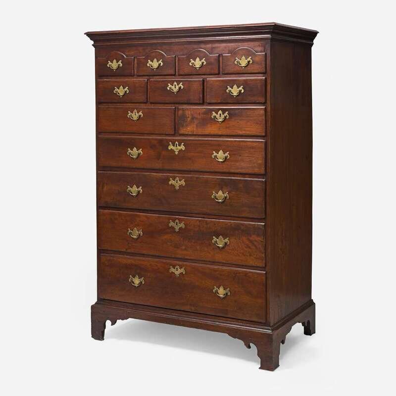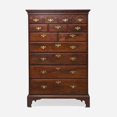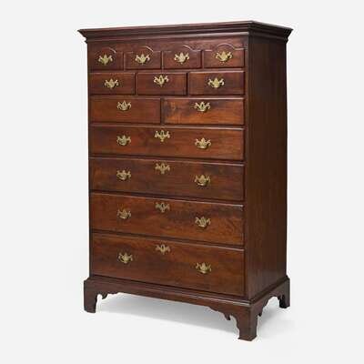 Molded top, four small arched drawers, over three short drawers, over two short drawers, over four graduated long drawers, molded base, shaped bracket feet.