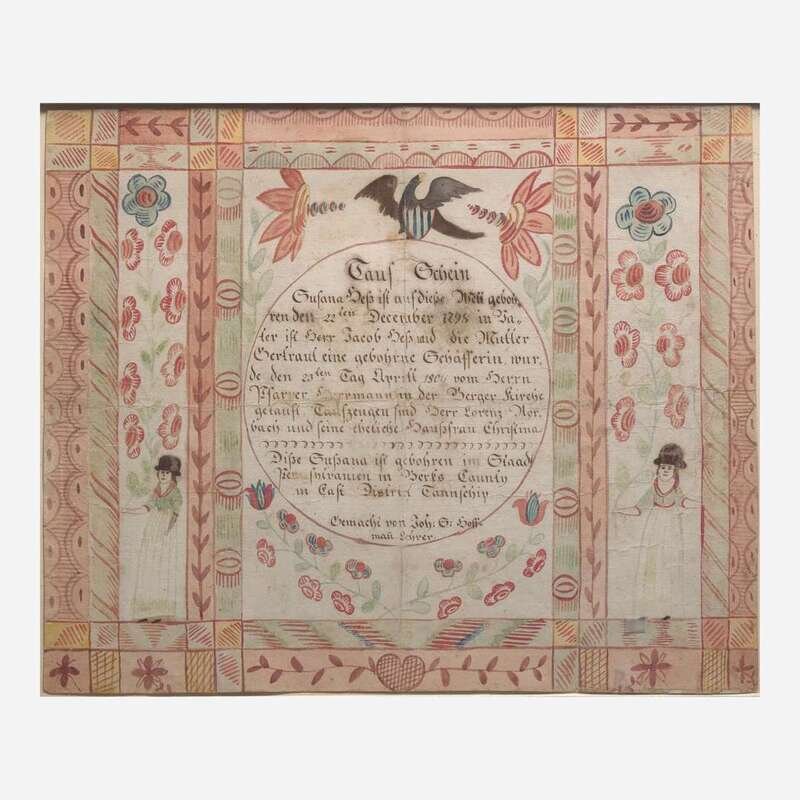A Fraktur birth and baptism record for Susanna Getz of Berks County Johannes Hoffman, early 19th century