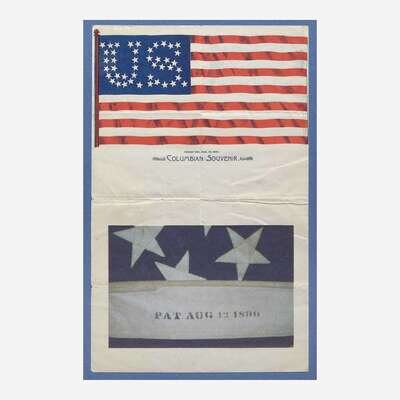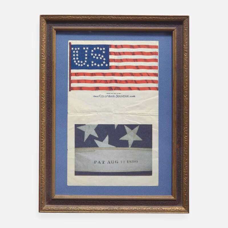 The felt stars arranged to form the initials "U S" machine-sewn to a three-part wool bunting canton, tredle machine-sewn wool bunting stripes, canvas header pocket stenciled, "Pat. Aug 12, 1890," retaining period hemp rope. Accompanied by printed sheet of period stationery illustrating the patented flag and captioned, "Design Pat. Aug 12,1890/ Columbian Souvenir," framed with photocopy of the patent date.