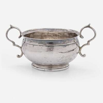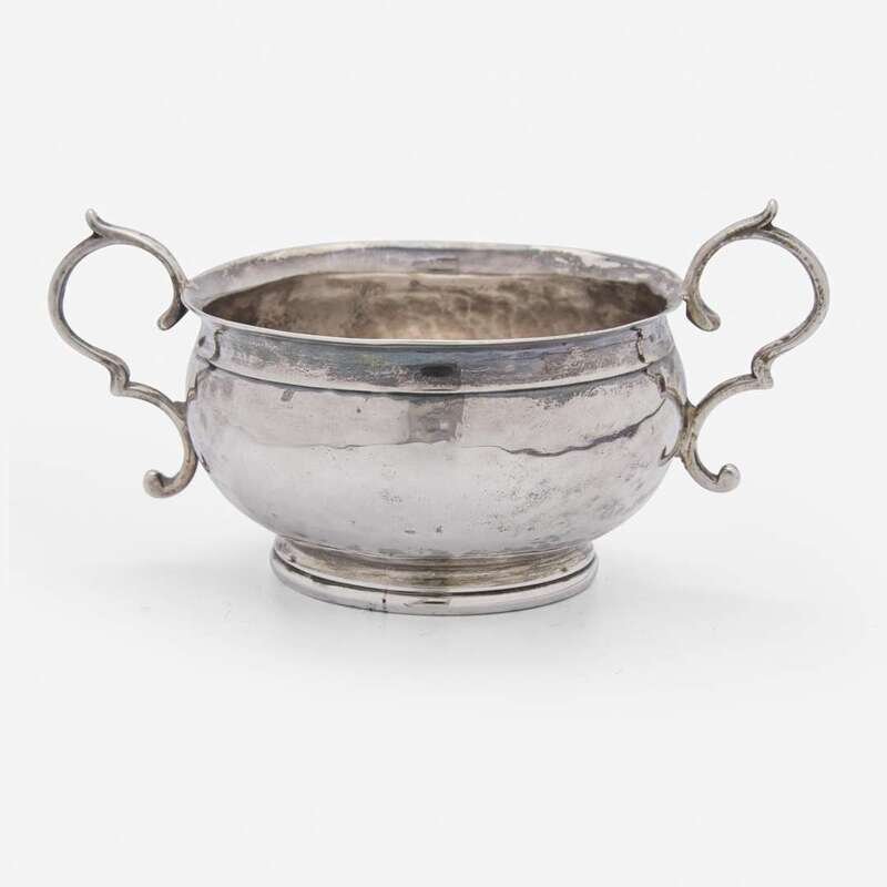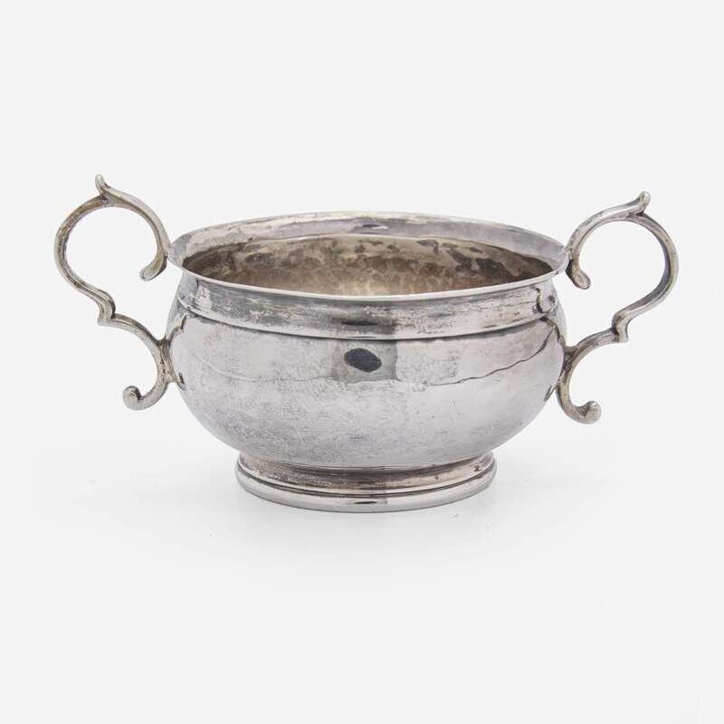 Flared rim, scrolled handles, footed base, underside engraved, "I*H," marked to interior well.
