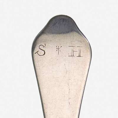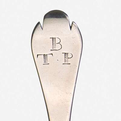 The William Cowell, Sr. spoon with oval bowl, flat handle with trefid end, "rattail" to bowl back, the underside of handle end engraved, "B/ T*P," marked; the John Burt spoon with dog-nose end, "rattail" to bowl back, underside of handle end engraved, "S*H," marked.