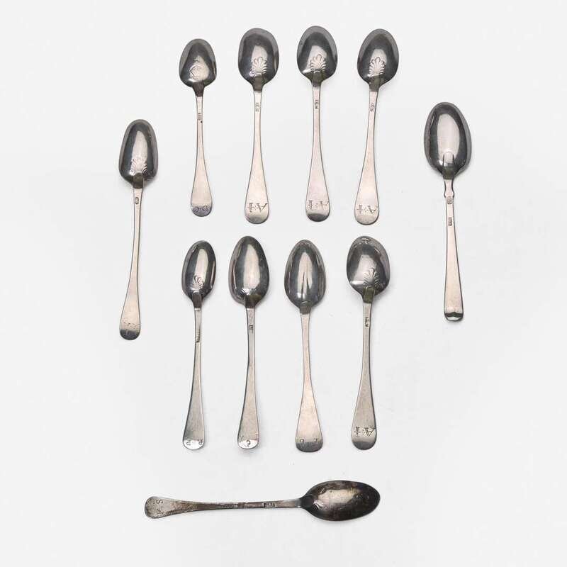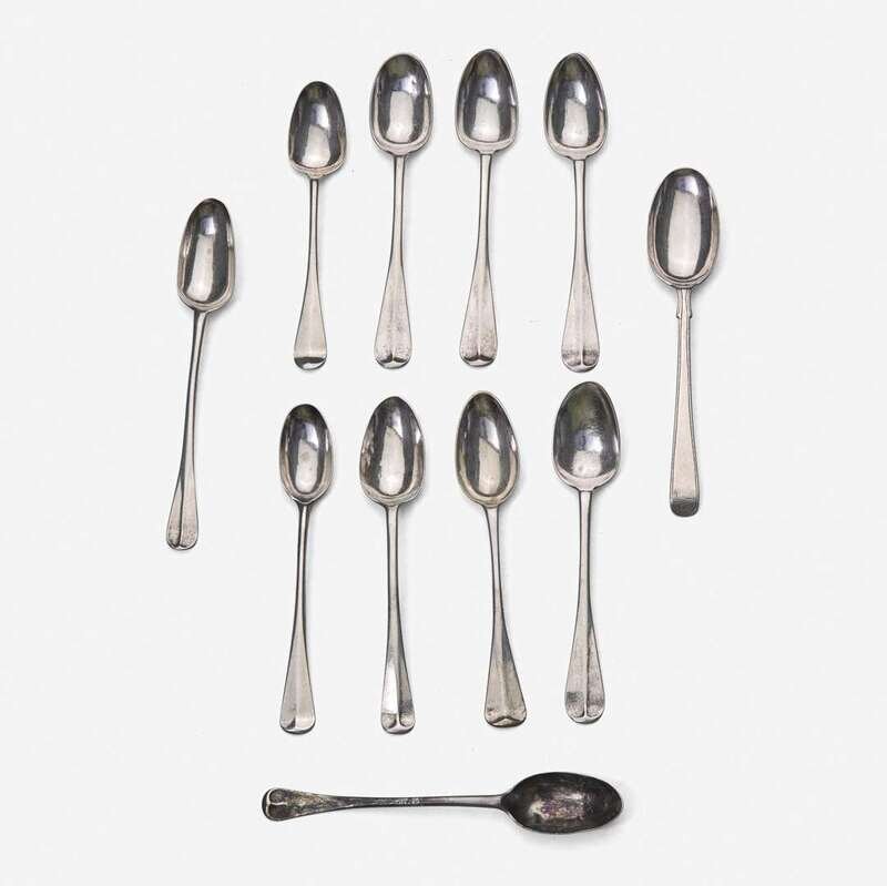Most of "Hanoverian" mid-rib form; comprising a spoon by John Burt Lyng (c. 1741-before 1785), New York, NY, circa 1760, incised border to handle and drop to bowl back, the round downturned end engraved, "D/ T*I," marked twice; a spoon by Nathaniel Austin (1734-1818), Boston, MA, circa 1760, with shell and drop to bowl back, underside of handle engraved, "C/ I*A," marked; a spoon by Benjamin Burt (1729-1805), Boston, MA, circa 1760, with shell and drop to bowl back, underside of handle engraved, "R*P," marked; a spoon by Daniel Rogers (1753-1792), Ipswich, MA, circa 1750, with shell and drop to bowl back, the underside of handle engraved, "I*T/ M*A," marked; a spoon by Caleb Beal (1746-1801), Hingham, MA, circa 1760, with shell and drop to bowl back, the underside of handle engraved, "D*C;" a spoon by Hezekiah Silliman (1738-1804), New Haven, CT, circa 1760, with shell and drop to bowl back, the underside of handle engraved, "F*S," marked; a set of four spoons by Ebenezer Chittenden (1726-1821), New Haven, CT, circa 1750, with shell and drop to bowl back, the underside handle engraved, "A*I," marked; and a spoon with no visible mark, circa 1730, with "rattail" to bowl back, the underside of handle engraved, "E*O."