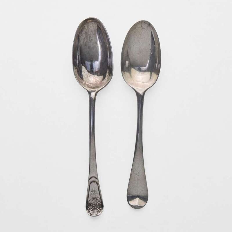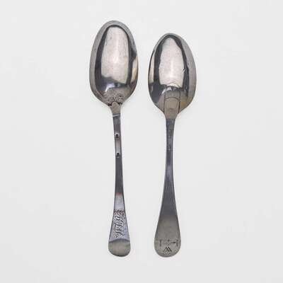 Two silver tablespoons Peter Vergereau (1700-1755) and Nicholas Van Rensselaer (active c. 1760-1770), New York, circa 1740 and 1765