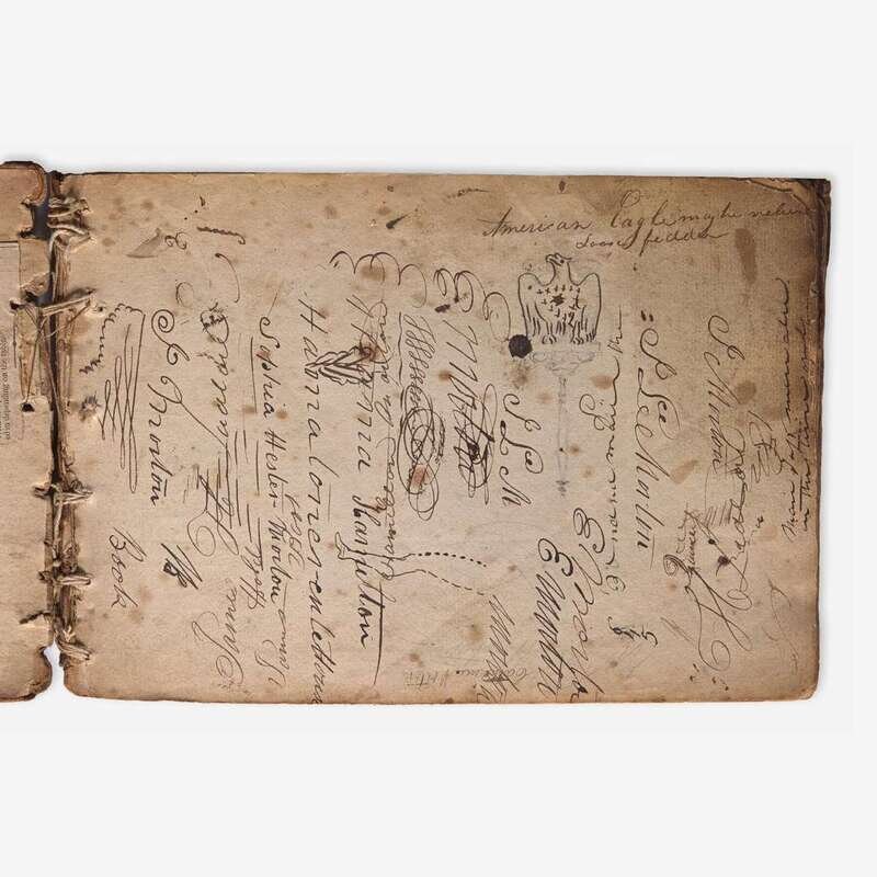With contemporary binding, stab-sewn, 40 leaves with two additional leaves laid in, including approximately 150 culinary and medicinal recipes written in several cursive hands in ink, front free end paper inscribed, "Catharine Morton/ 1791;" the rear end papers inscribed "Sophia Hester Morton," "E. Morton," and "J. Lee Morton;" and include a whimsical ink drawing of an American eagle with stars and the inscription, "American Eagle may he never loos a fedder.." One leaf with ink sketch of fancy dress costumes and a profile. Manuscript indexed in rear. 19th-century newsprint clippings regarding health issues mounted on front and rear paste-downs.