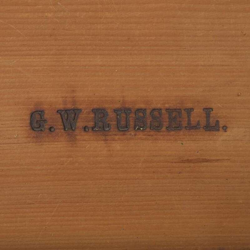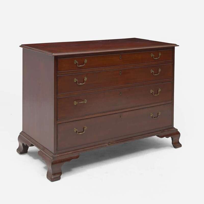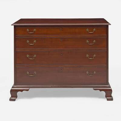 Molded rectangular top, four graduated drawers, molded base, on shaped ogee feet, interior of top drawer branded, "G.W. Russell," verso retaining old label inscribed, "This bureau was given to M K J by Mrs* Russell/ It belonged to Dr Russells first wife who was Elizabeth Russell/ She was the sister of Reuel H Tuttle."