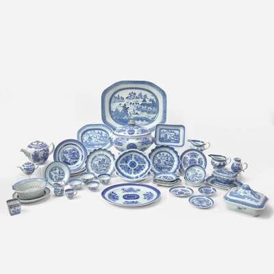 A large collection of forty-two Chinese Export porcelain Canton and Blue Fitzhugh tablewares late 18th / early 19th century