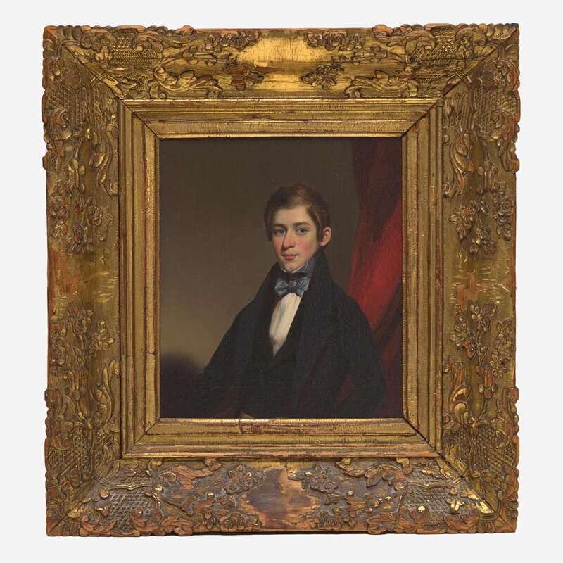 Oil on canvas, retains extensive typed label from Child's Gallery, Inc. Boston, which states "Inscribed on original stretcher: S. Weir Lewis of Philadelphia by Lamqua, a Chinese Artist," carved and gilded Chinese frame.