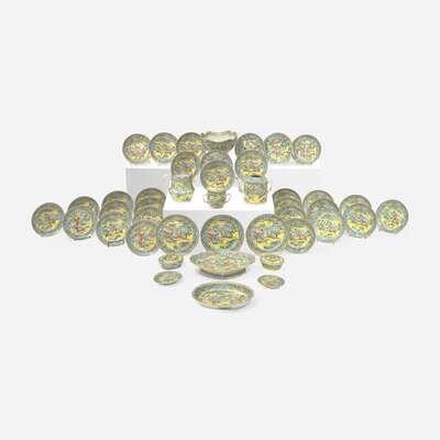 All with yellow and turquoise ground, depicting warriors in a landscape with dragon borders; comprising thirty-three plates / dishes, an oval dish, a lobed bowl, a footed bowl, a pitcher, a coffeepot, a covered sugar dish, and a pair of covered butter tubs and stands.