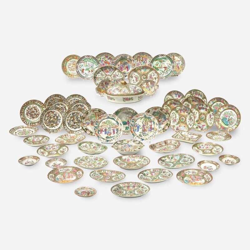 Including Rose Medallion, Rose Mandarin, Famille Rose, and Famille Verte examples; comprising an oval warming dish and cover, a round warming plate, forty-nine dishes / plates of various forms, and four saucers.