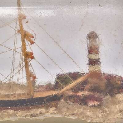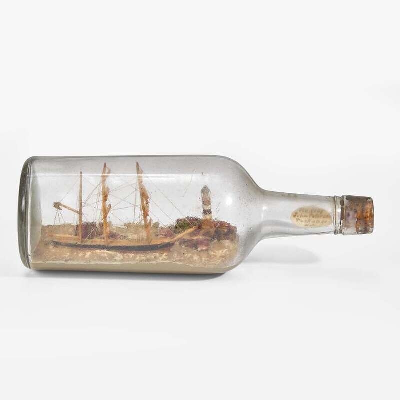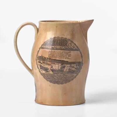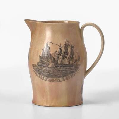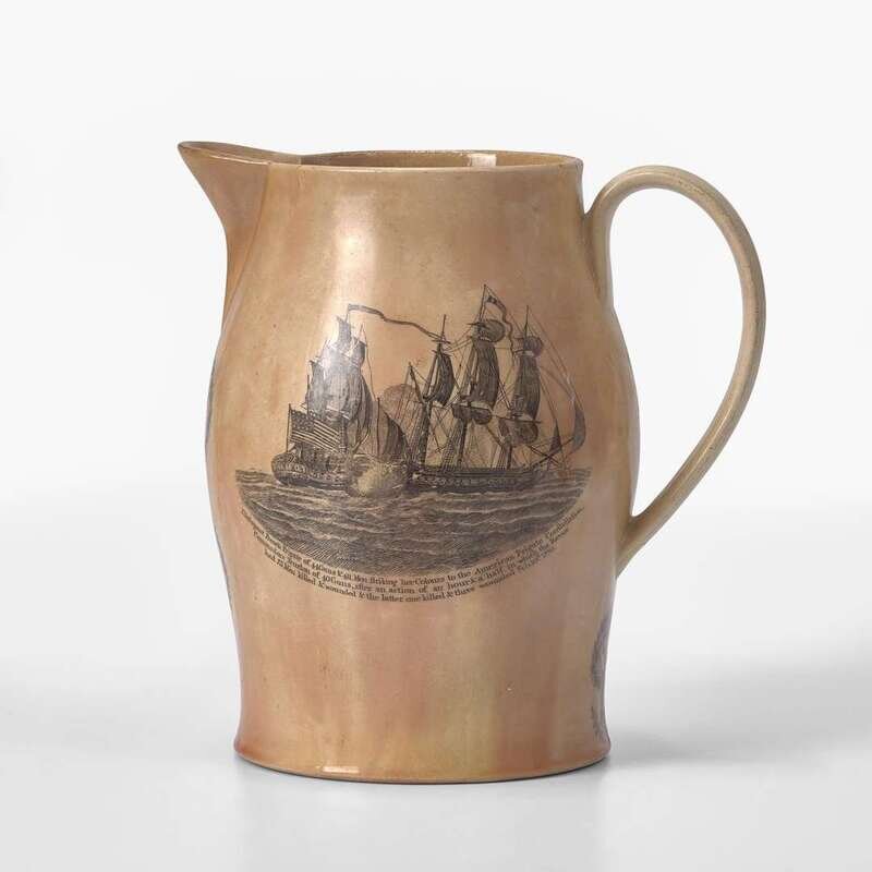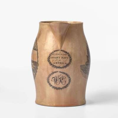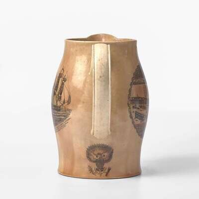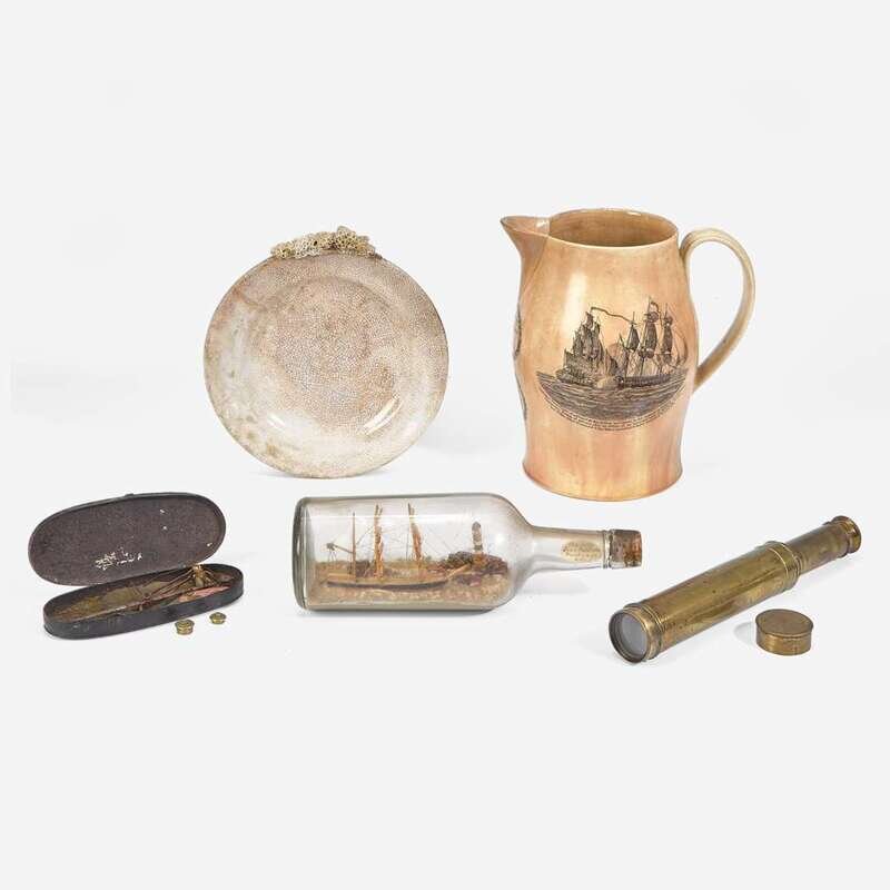 Comprising a Liverpool creamware pitcher, with laurel wreath cartouches under spout inscribed, "Success to the Infant Navy of America" and "WK," one side bearing bearing poem describing success of the new nation alongside depiction of American ships beside fortified structures and people working the land, the other side depicting naval battle of the USS Constellation vs. L'Insurgente on February 9, 1799, and patriotic eagle and shield below handle; a stone china plate by J.W. Pankhurst & Co., encrusted with coral on edge; a ship and lighthouse diorama in a bottle, with interior label inscribed, "Made by John Peterson/ Tuckahoe, N.J."; a portable brass telescope; and a tinware case with miniature scale and weights.