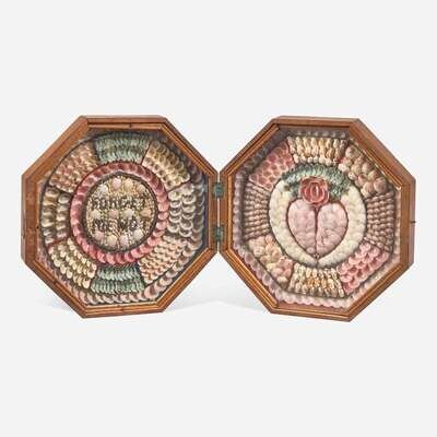 The left side with round center with inscription, "Forget Me Not," the right side with shells arranged as a heart and flower, hinged octagonal case.