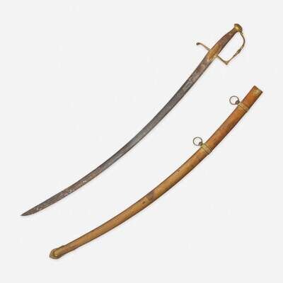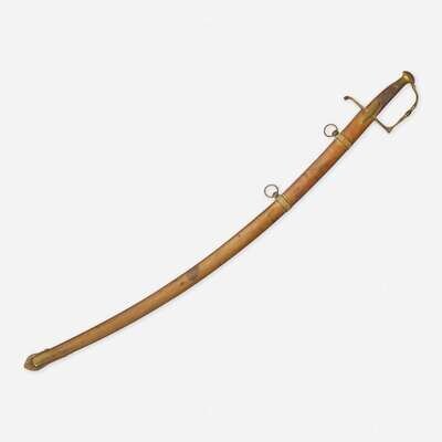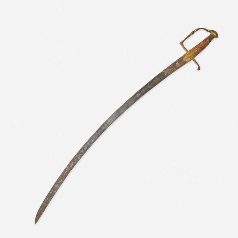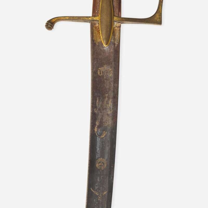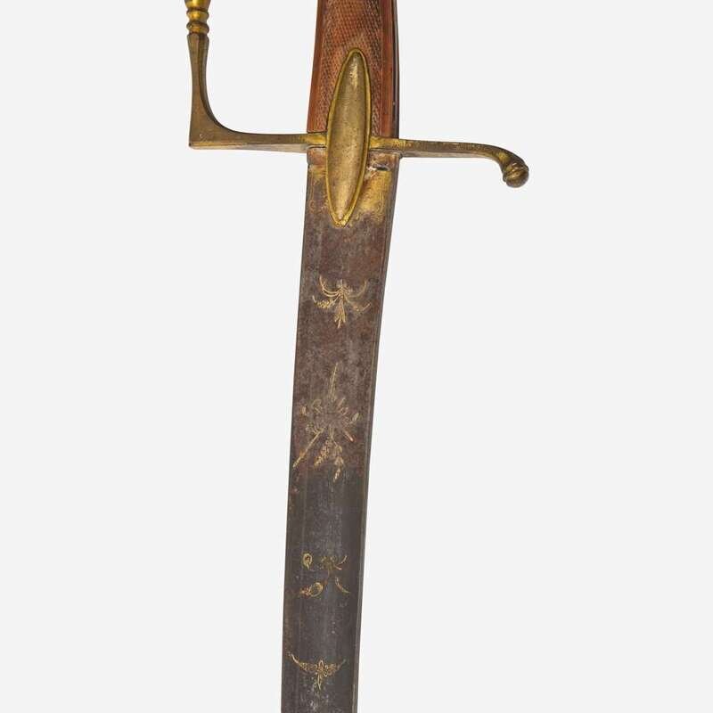 Steel blade with engraved and embossed floral sprigs and sun motif, engraved monogram near guard, "C...," (?), brass hilt and scabbard.