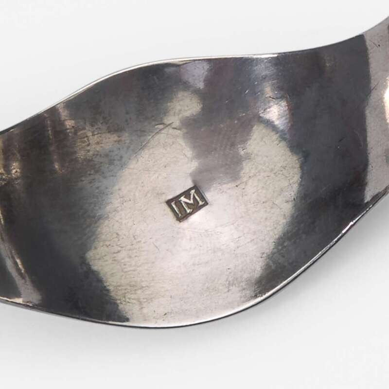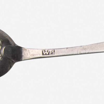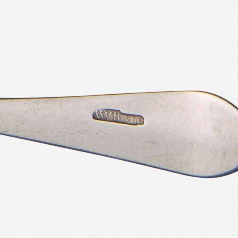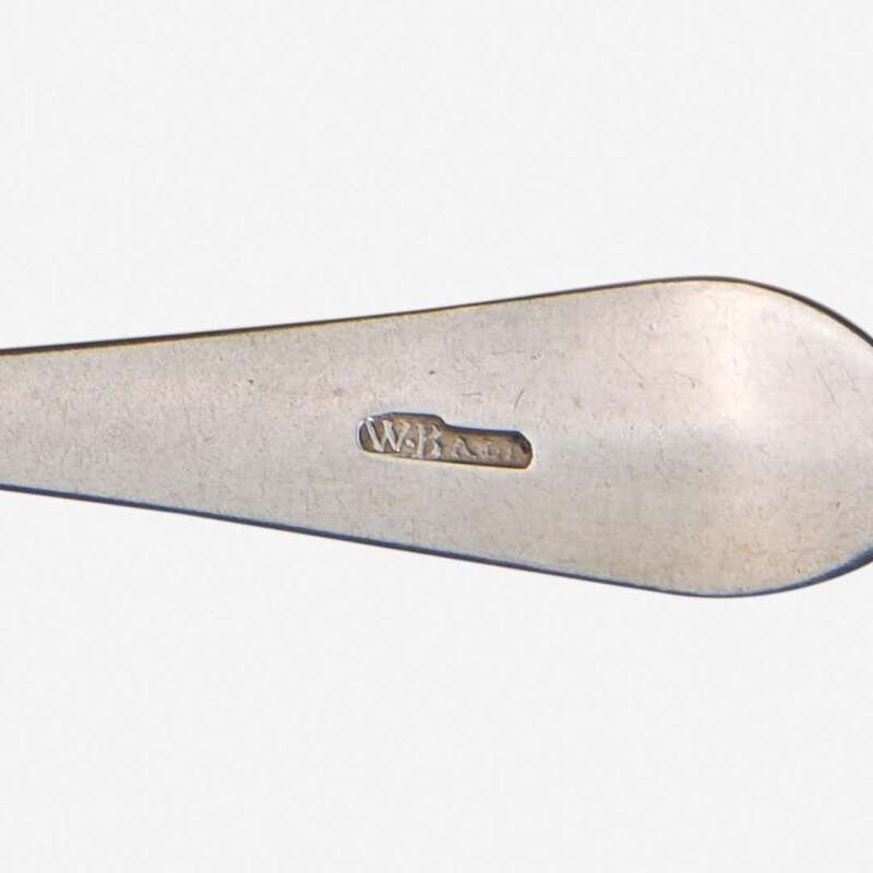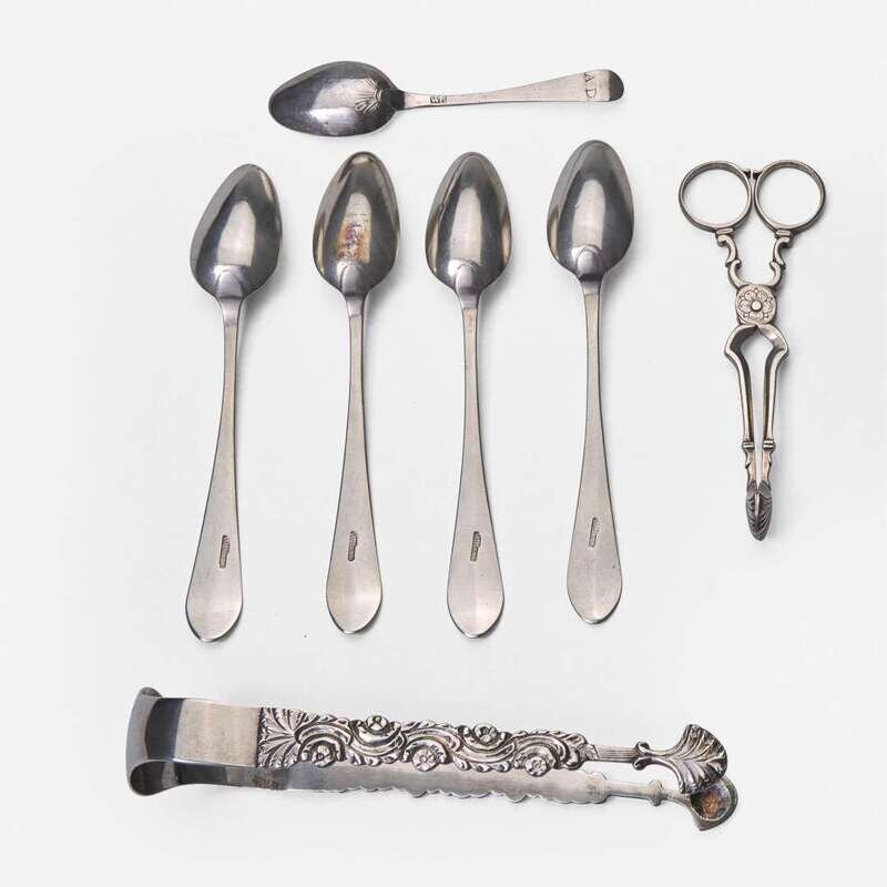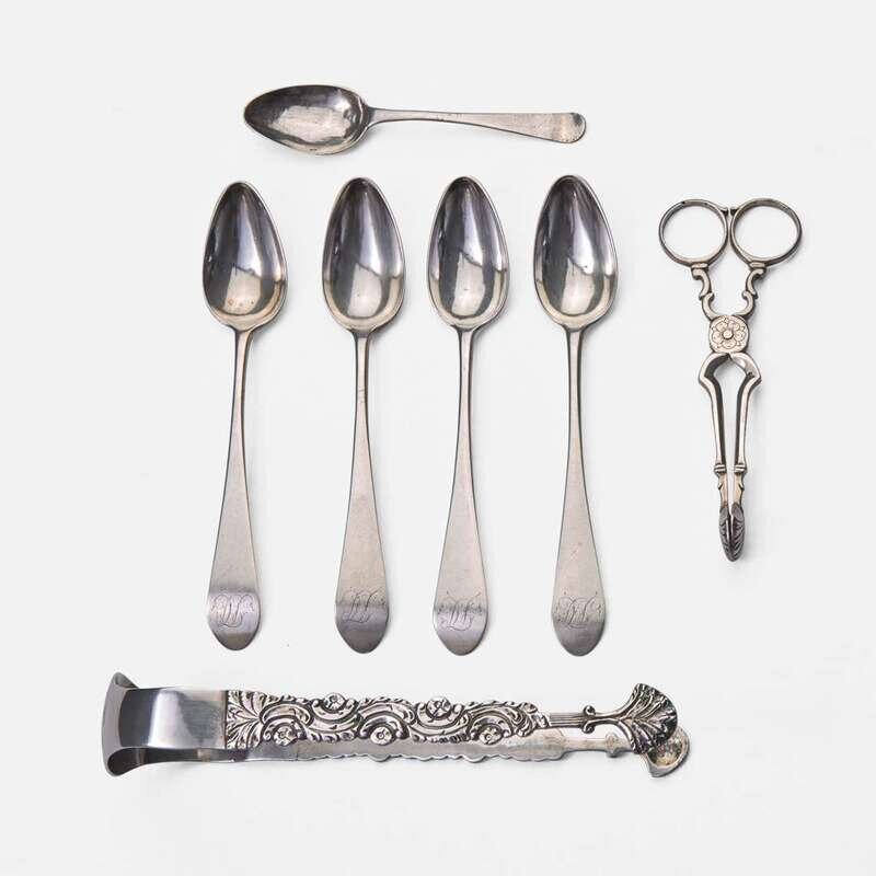 Comprising a set of four teaspoons by William Ball of Baltimore (1763-1810), circa 1790, with drop to bowl back, handle ends engraved, "JTC," marked; a single coffee spoon by William Ball of Philadelphia (1729-1810), circa 1760, of "Hanoverian" mid-rib form, with shell back, the underside of handle end engraved, "AD," marked; a sugar nips by William Ball of Philadelphia (1729-1810), circa 1750, with cast scrolled arms, shell-form bowls, engraved rosette at central crossing, one arm engraved, "M*R," marked twice, once to each bowl well; and a sugar tongs by John Murdock, circa 1780, with floriate cast arms, shell-form bowls, the end engraved, "TCMT," marked.
