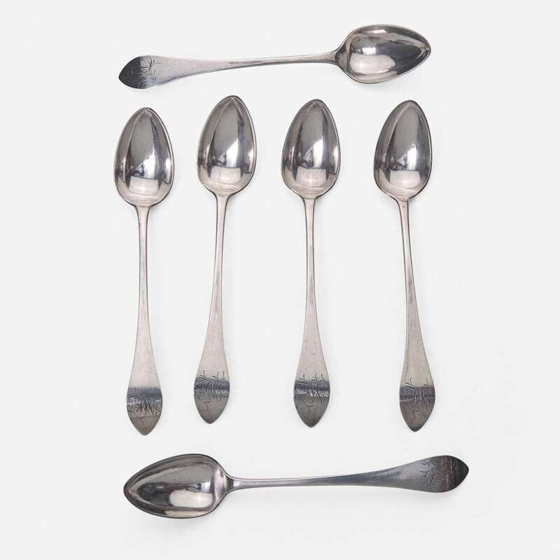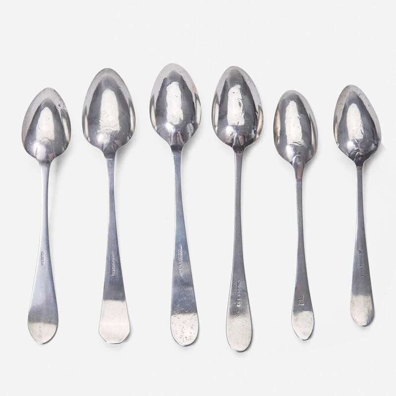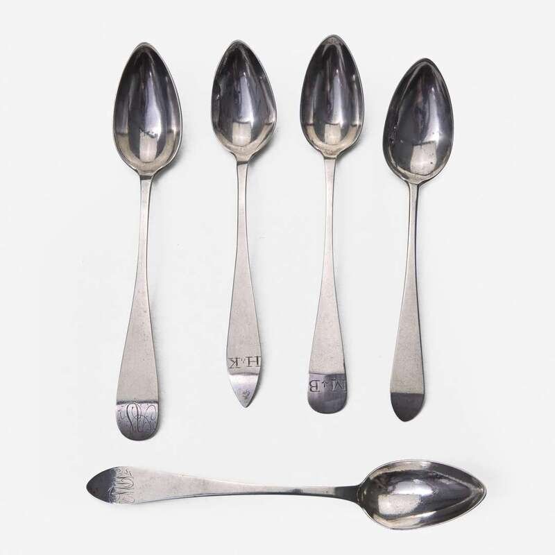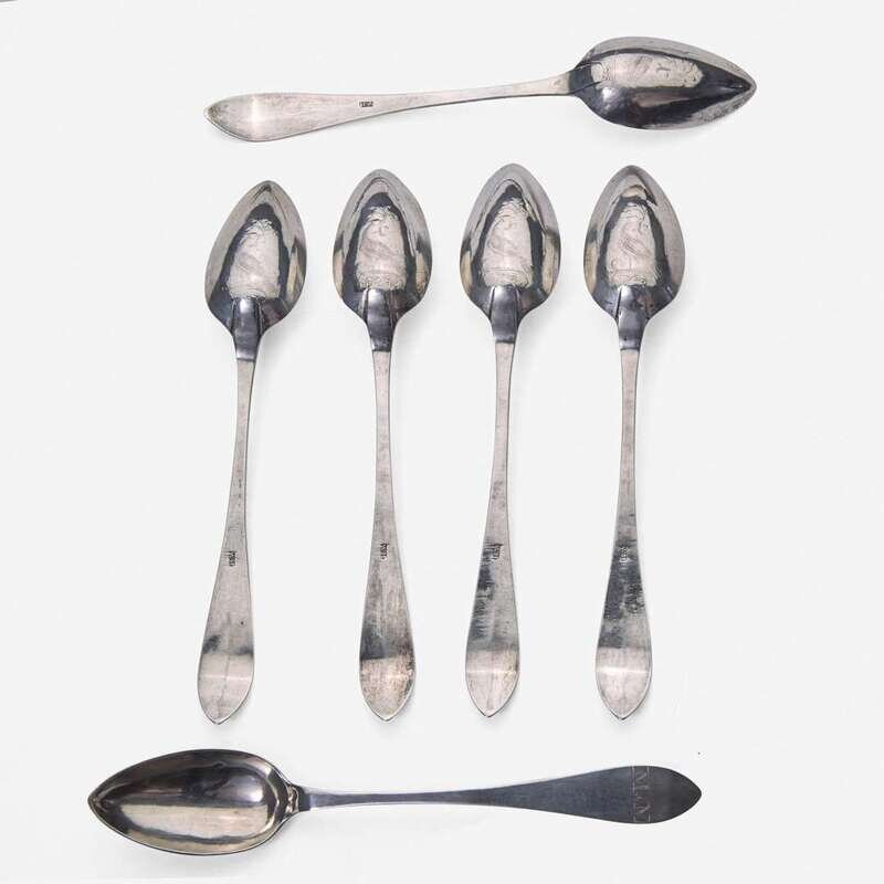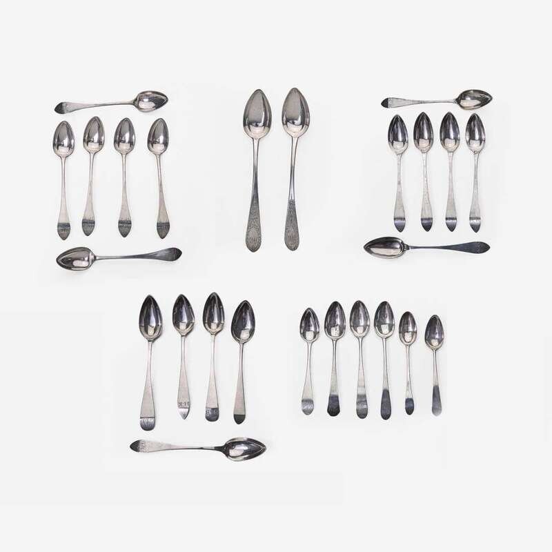 Including pieces by the following makers: David Hall (1767-1814), William Haverstick, Sr. (1756-1823), and William Haverstick, Jr. (1780-1859) of Lancaster, PA, William Mannerback (1762-1838) of Reading, PA, George Armitage (active 1799-1827), John D. Germon (1751-1829), Samuel Richards, Jr. (1765-1827), William Walker, and Christian Wiltberger (1769-1851) of Philadelphia, PA, and Nathaniel Coleman (1765-1842) of Burlington, NJ; comprising a set of six bird-back teaspoons by David Hall, circa 1790, with drop to bowl back, pointed downturned ends engraved, "ML," marked twice; a set of six bird-back teaspoons by William Haverstick, Sr., circa 1795, with drop to bowl back, pointed downturned ends engraved, "MM," marked; three assorted bird-back teaspoons by William Haverstick, Sr., circa 1780-1790, each with drop at bowl back and rounded or pointed downturned ends engraved respectively, "M*B," "MW," and "HK," marked; a wheat-back teaspoon by William Haverstick, Jr., circa 1800, with drop to bowl back, rounded downturned end engraved, "AS," marked; a pair of eagle-back teaspoons by George Armitage, circa 1800, with drop to bowl back, bright-cut decoration, pointed downturned ends engraved, "LMK," marked; a bird-back teaspoon by John D. Germon, circa 1800, with drop to bowl back and pointed downturned end, marked; two assorted teaspoons by Samuel Richards, Jr., circa 1795, one with bird and drop to bowl back, round downturned end engraved, "LH," the other with drop to bowl back, pointed downturned end, both marked; a bird-back teaspoon by William Walker, circa 1800, with drop to bowl back, round downturned end engraved, "JJD/ 1801," marked; an urn-back teaspoon by Christian Wiltberger, circa 1795, with drop to bowl back and pointed downturned end, marked; an urn-back teaspoon by William Mannerback, circa 1820, with drop to bowl back, pointed downturned end engraved, "CH," marked; and a basket-back teaspoon by Nathaniel Coleman, circa 1800, with coffin downturned end engraved, "AM," marked.