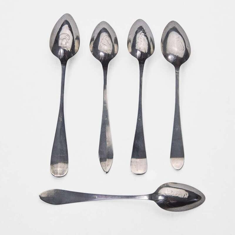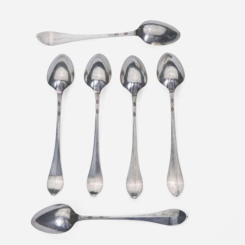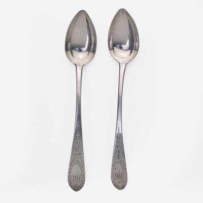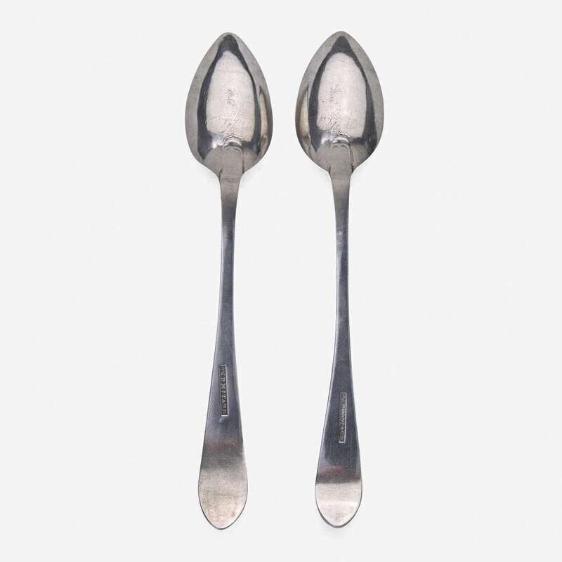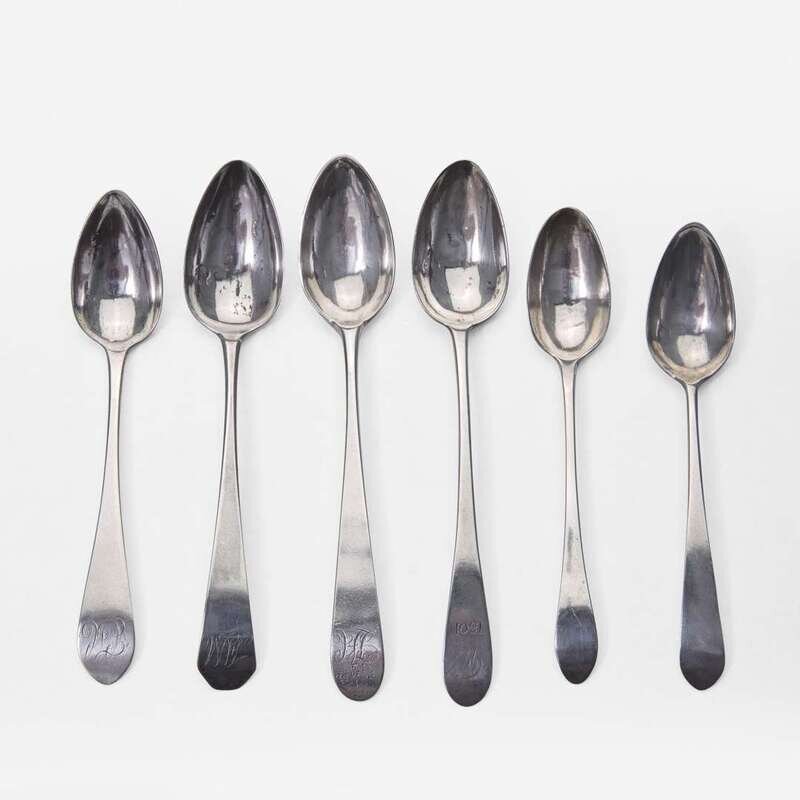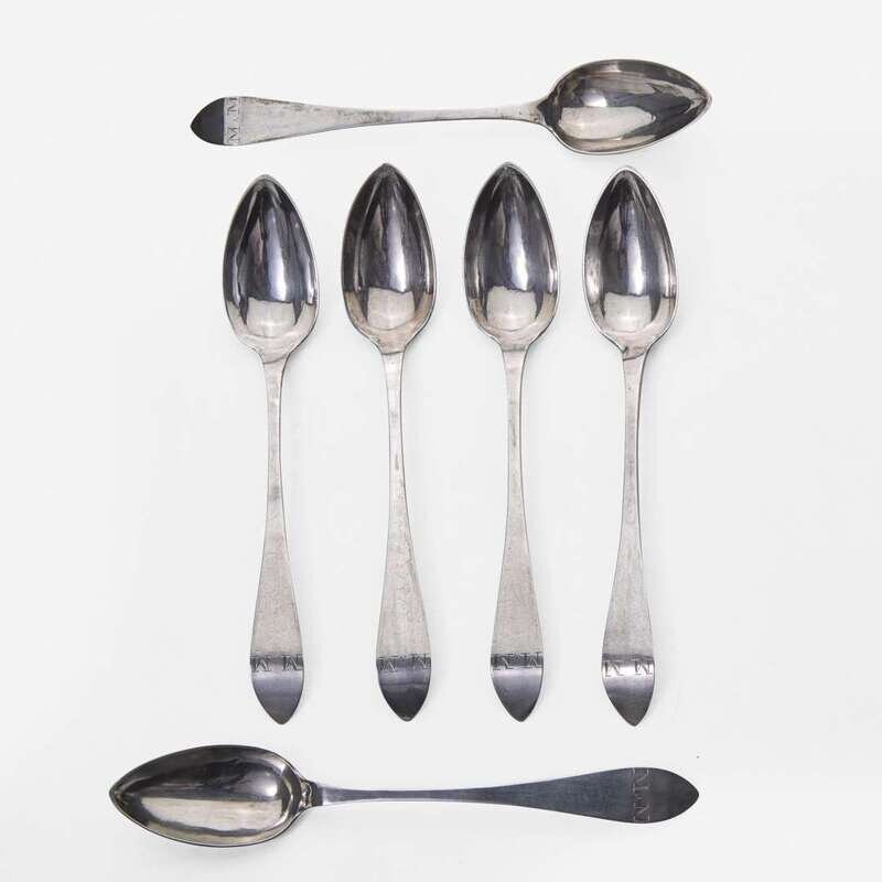 Including pieces by the following makers: David Hall (1767-1814), William Haverstick, Sr. (1756-1823), and William Haverstick, Jr. (1780-1859) of Lancaster, PA, William Mannerback (1762-1838) of Reading, PA, George Armitage (active 1799-1827), John D. Germon (1751-1829), Samuel Richards, Jr. (1765-1827), William Walker, and Christian Wiltberger (1769-1851) of Philadelphia, PA, and Nathaniel Coleman (1765-1842) of Burlington, NJ; comprising a set of six bird-back teaspoons by David Hall, circa 1790, with drop to bowl back, pointed downturned ends engraved, "ML," marked twice; a set of six bird-back teaspoons by William Haverstick, Sr., circa 1795, with drop to bowl back, pointed downturned ends engraved, "MM," marked; three assorted bird-back teaspoons by William Haverstick, Sr., circa 1780-1790, each with drop at bowl back and rounded or pointed downturned ends engraved respectively, "M*B," "MW," and "HK," marked; a wheat-back teaspoon by William Haverstick, Jr., circa 1800, with drop to bowl back, rounded downturned end engraved, "AS," marked; a pair of eagle-back teaspoons by George Armitage, circa 1800, with drop to bowl back, bright-cut decoration, pointed downturned ends engraved, "LMK," marked; a bird-back teaspoon by John D. Germon, circa 1800, with drop to bowl back and pointed downturned end, marked; two assorted teaspoons by Samuel Richards, Jr., circa 1795, one with bird and drop to bowl back, round downturned end engraved, "LH," the other with drop to bowl back, pointed downturned end, both marked; a bird-back teaspoon by William Walker, circa 1800, with drop to bowl back, round downturned end engraved, "JJD/ 1801," marked; an urn-back teaspoon by Christian Wiltberger, circa 1795, with drop to bowl back and pointed downturned end, marked; an urn-back teaspoon by William Mannerback, circa 1820, with drop to bowl back, pointed downturned end engraved, "CH," marked; and a basket-back teaspoon by Nathaniel Coleman, circa 1800, with coffin downturned end engraved, "AM," marked.
