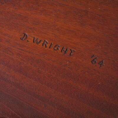 The long tray with four wells signed: "Wright '60"; the long shallow tray signed: "D. Wright '58"; the three-well server unmarked; the shorter tray with upturned sides signed: "D. Wright '64"; the shallow square-form abstract tray signed: "D. Wright '64"; the smaller abstract bowl signed: "Wright '62"; the larger abstract bowl unmarked; the ladle unmarked.