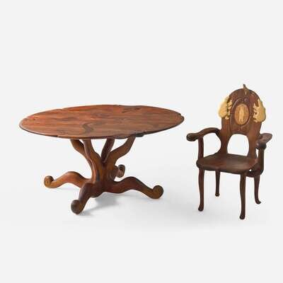 Table signed to underside of top: "John Bauer"; one chair signed to underside of seat: "J. Bauer 1979"; the Polar Bear chair signed to underside of seat: "Polar Bear Chair, Walnut, Quilted Maple, Holly, Ebony, Mahoe, Bloodwood, John Bauer, 2008"
