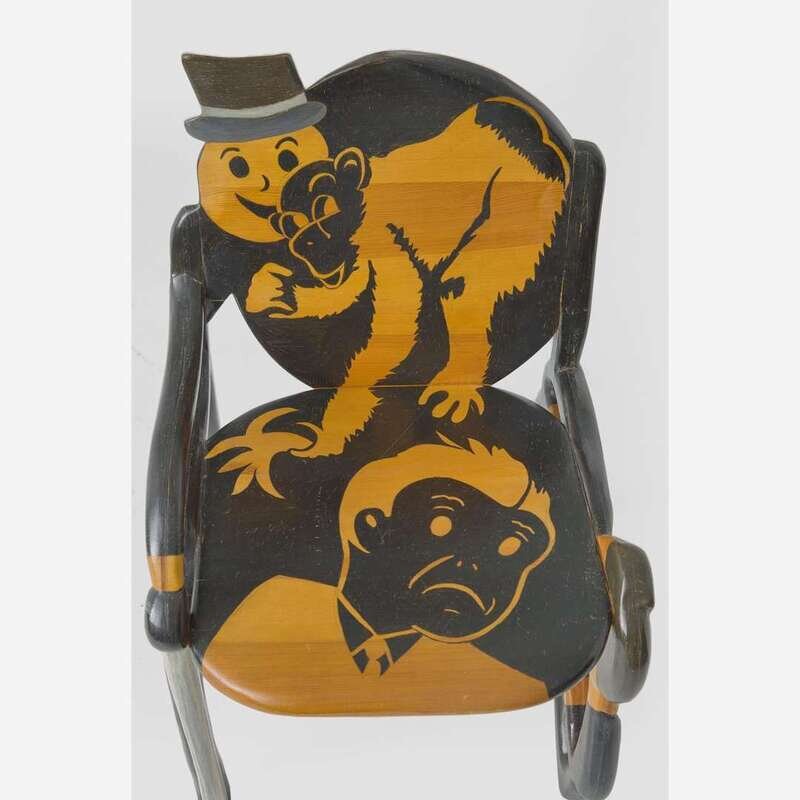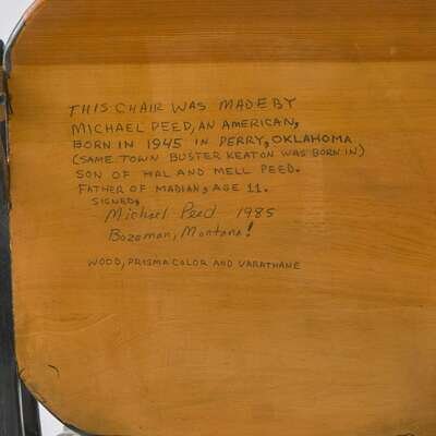 Signed to underside of seat: "This chair was made by Michael Peed, an American, born in 1945 in Perry, Oklahoma (same town Buster Keaton was born in) son of Hal and Mell Peed. Father of Madian, age 11. Signed, Michael Peed 1985 Bozeman, Montana! Wood, Prismacolor and Varathane"