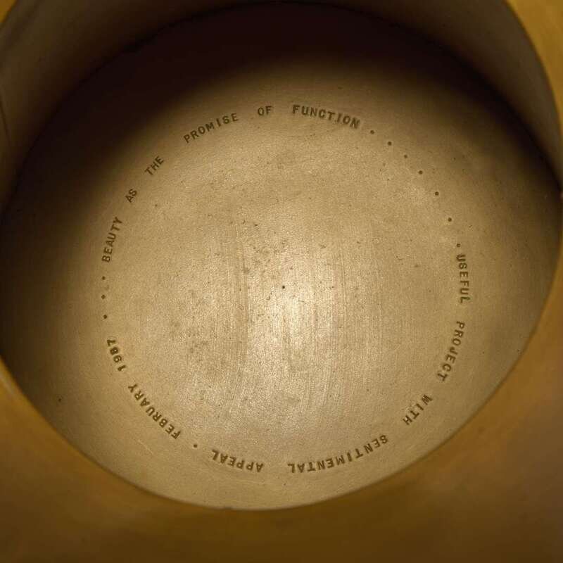 Impressed lettering to interior floor of vessel: "USEFUL PROJECT WITH SENTIMENTAL APPEAL, FEBRUARY 1987, BEAUTY AS THE PROMISE OF FUNCTION"