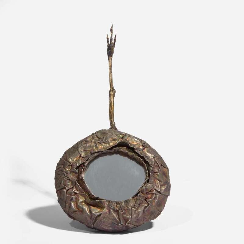 Gold and silver cloisonné, polychrome enamel on copper, electro-formed silver, mirrored glass, pebbles, cast bronze