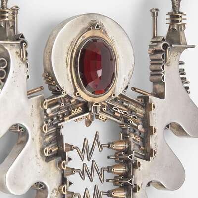 Fabricated and manipulated silver tubing, gold, semiprecious stone