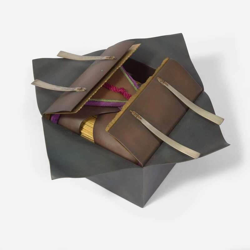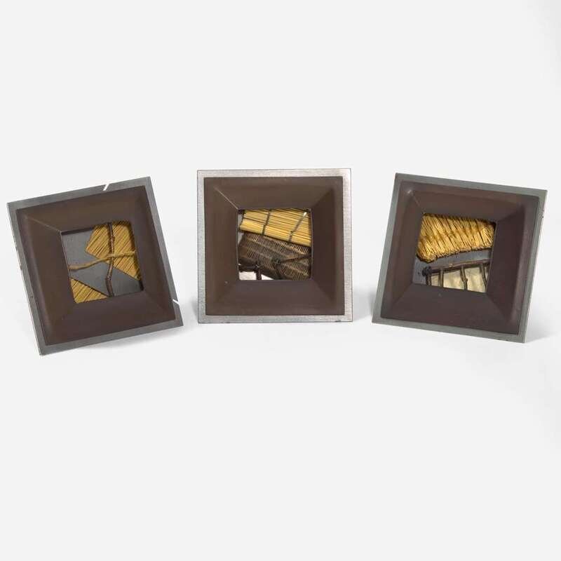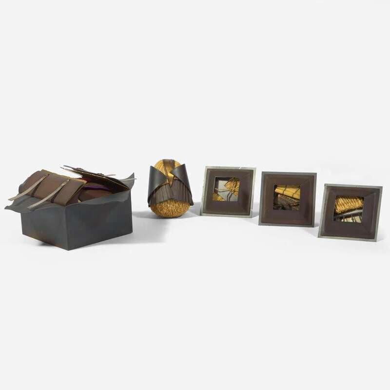 Comprised of three square brooches with conforming pin backs, a small sculpture in the form of a bundle of straw wrapped in a mixed-metal sleeve, and a box-form sculpture containing a straw bundle in a mixed-metal sleeve