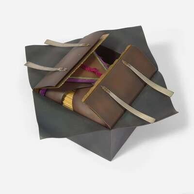 H: 3 3/4, W: 7, D: 7 in. (box sculpture); L: 3 3/4, W: 2 7/8, D: 2 1/4 in. (bundle sculpture); L: 3 1/4, W: 3 1/4. D: 5/8 in. (brooches, ea.)