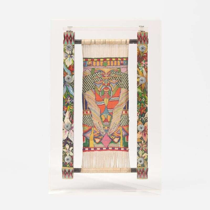 Small woven tapestry on miniature loom with painted elements in an acrylic case