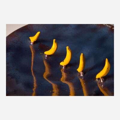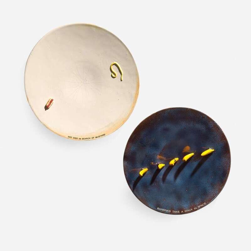 Glazed and overglaze enamel painted earthenware with applied lettering to faces: "Bananas Take a Walk in Space" and "Hot Dog in Search of Mustard"