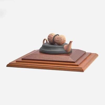Nonfunctional teapot sculpture integral to mahogany base, housed within a mahogany and glass vitrine lid
