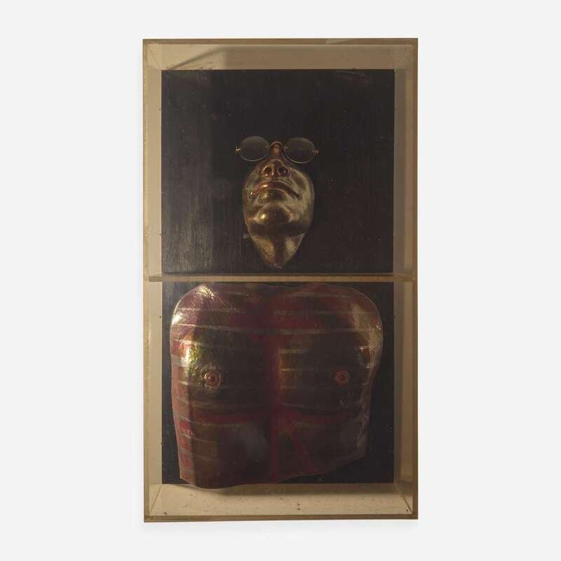 A sculpture in three parts (two glazed ceramic elements, along with a section of a pair of eyeglasses), mounted to painted plywood within an acrylic case