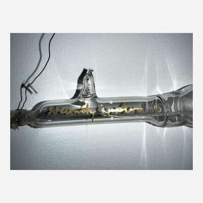 Blown glass with enclosed gases, electrical elements (housed in artist's painted wooden box)