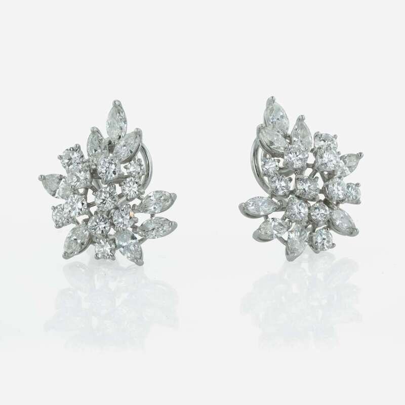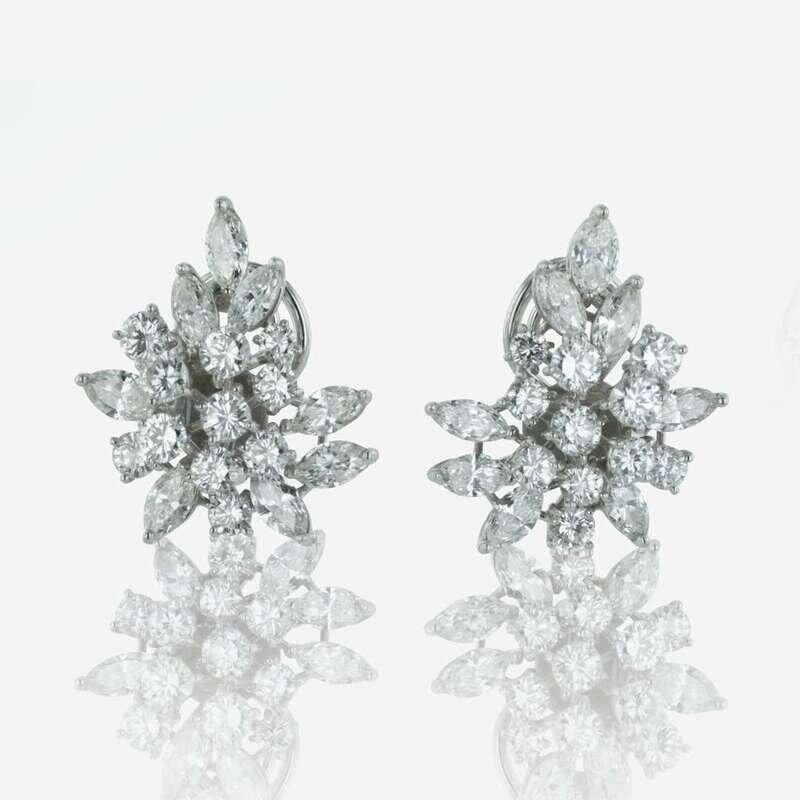 Designed as a cluster of diamonds, set with a total of 38 marquise and brilliant cut round diamonds, estimated total diamond weight of 5.5-5.70 carats, SI- Near colorless G-I diamonds. Ear clips for non pierced ears.