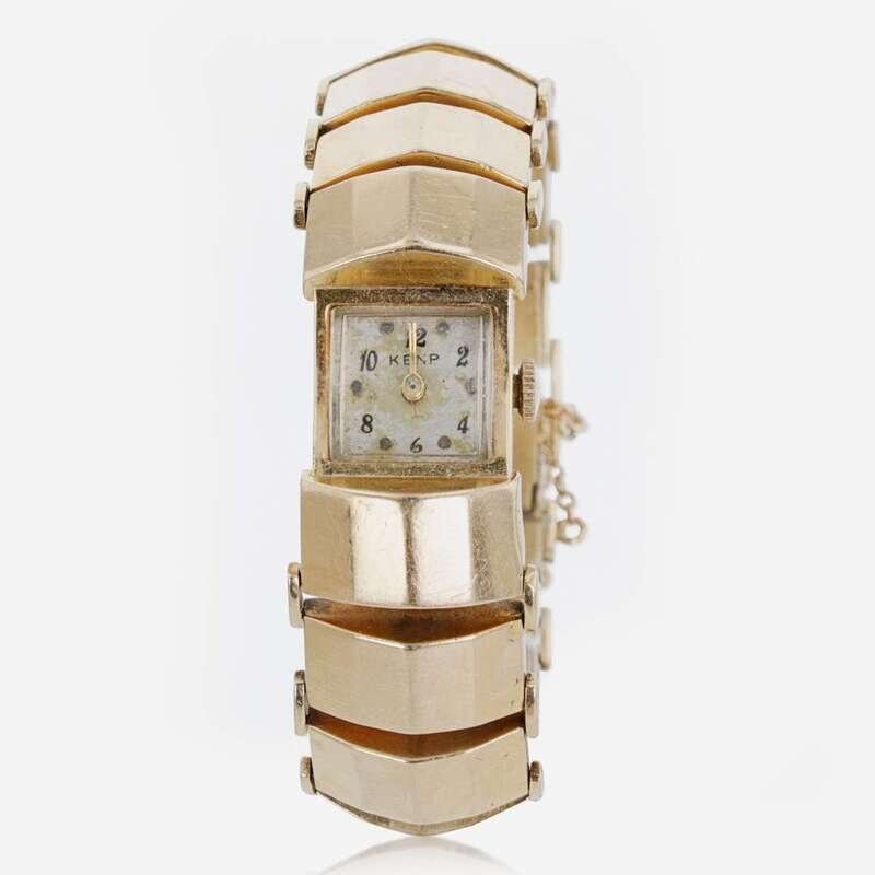 A retro ladies watch, designed as large 14K yellow gold links, quartz battery operated. White dial, marked "KENP", with black Arabic numeral and gold hands.