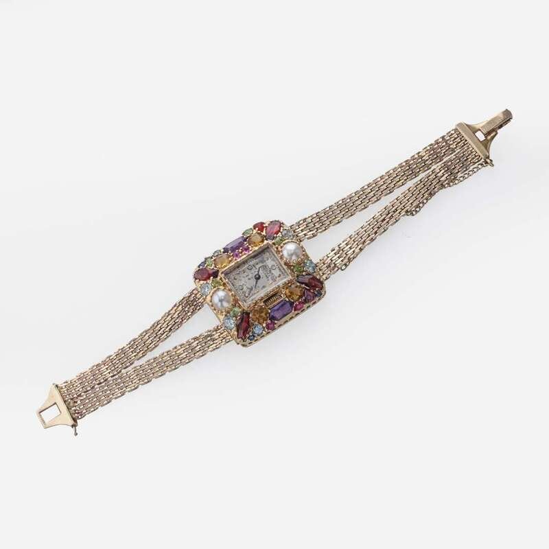 A mechanical manual wind ladies bracelet watch, with silvered square dial, dot and diamond markers, black hands, framed by various gemstones.
