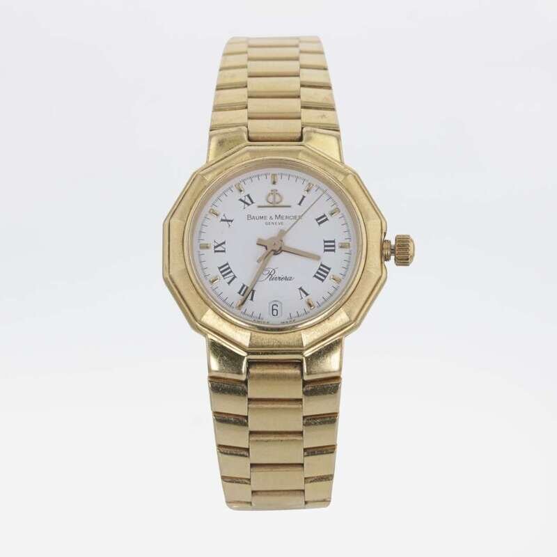 A Baume & Mercier 18K yellow gold wristwatch, with white dial, gold hands and hour markers, Swiss-made, with roman numerals. Quartz battery operated, crown screws in, and dial has seconds complication and date at 6 o'clock.