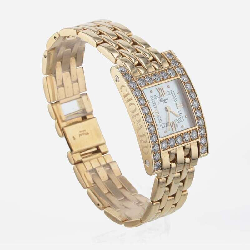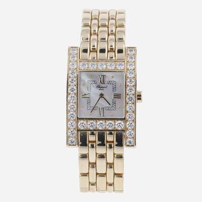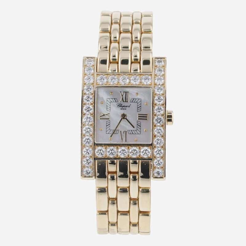 Quartz movement watch, with square mother-of-pearl dial with Roman numeral markers, diamond-set bezel, set with round brilliant-cut diamonds in a yellow gold case. Integrated 18K yellow gold bracelet with a fold over clasp set with a small accent diamond. Diamonds are near colorless (G - J), with SI clarity. Total estimated weight of diamonds: 2.38 carats.