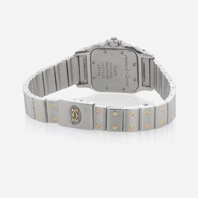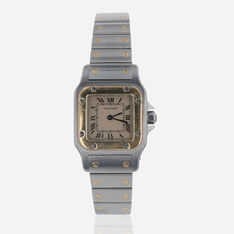 A quartz battery-operated ladies wristwatch with an off-white dial, squared case, Roman numeral hour markers, 18K yellow gold bezel and a two-tone bracelet with a deployment clasp.